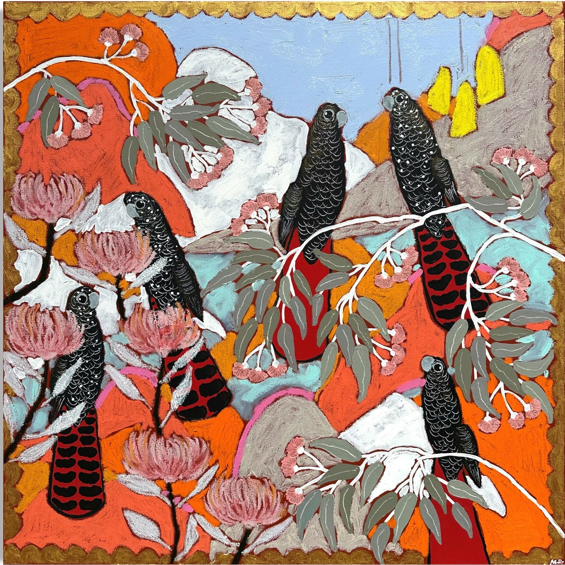 Red tailed cockatoos in eucalyptus.