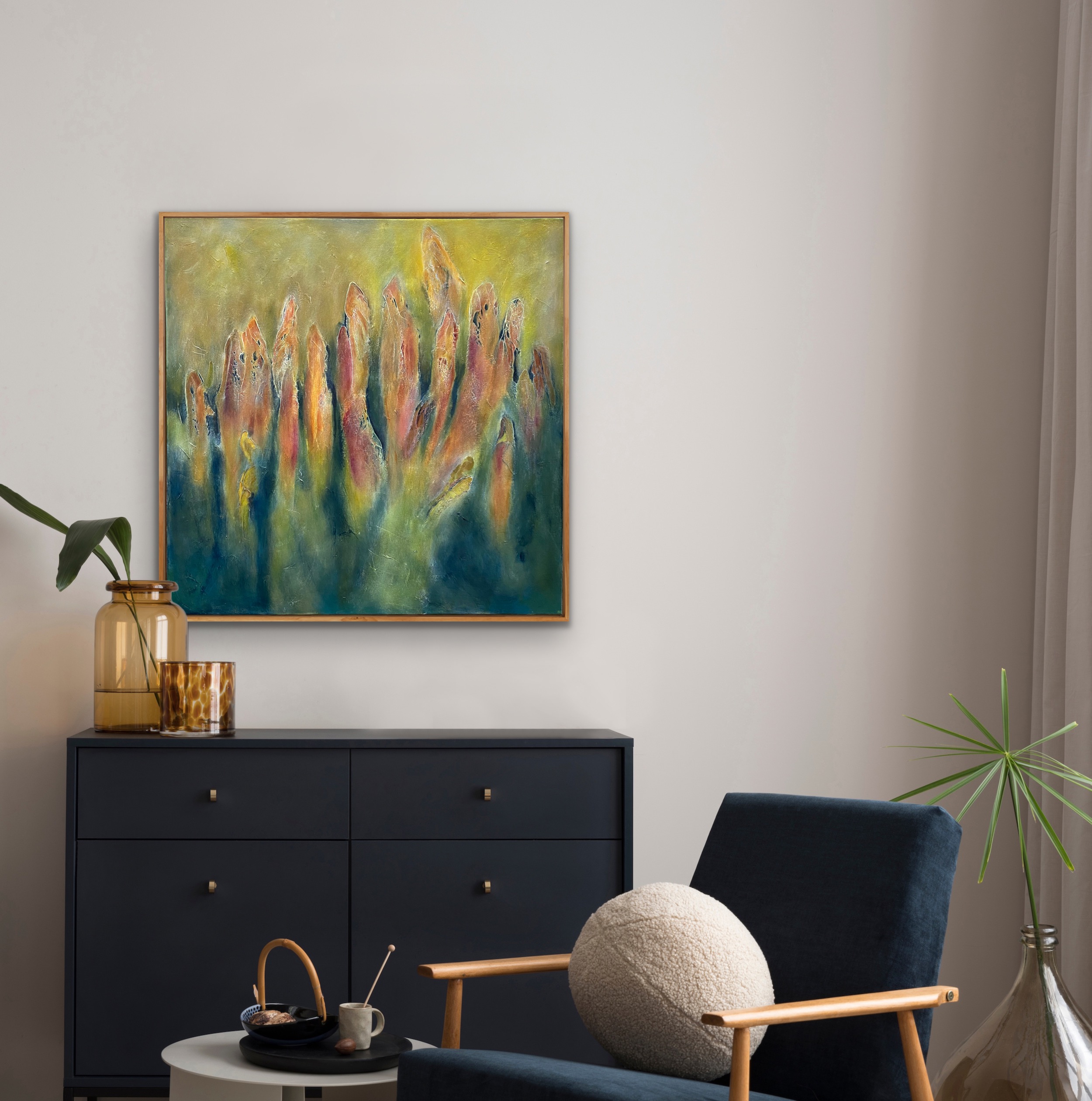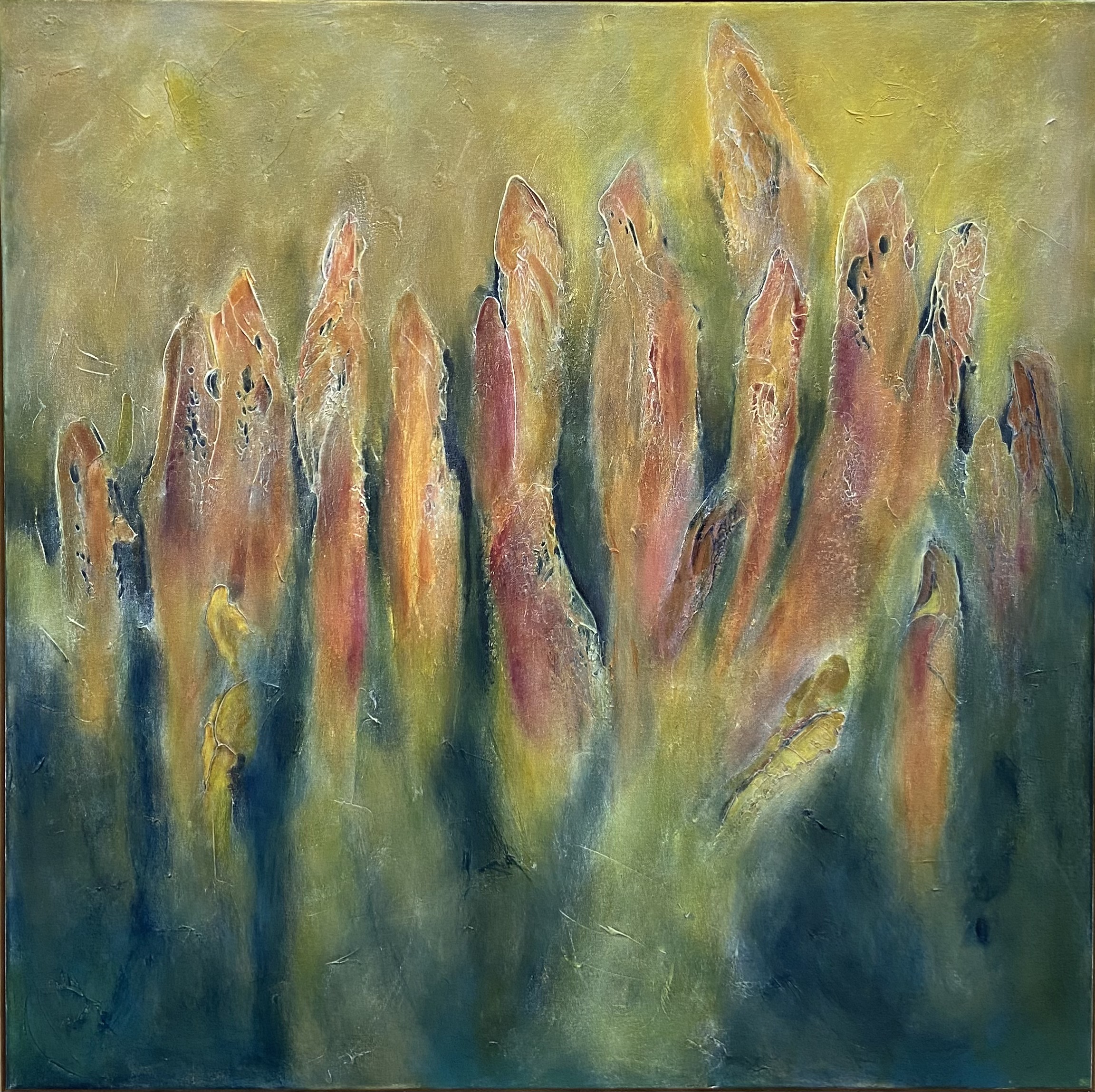 Material: Oil, cold wax and marble dust on canvas, floating oak frame