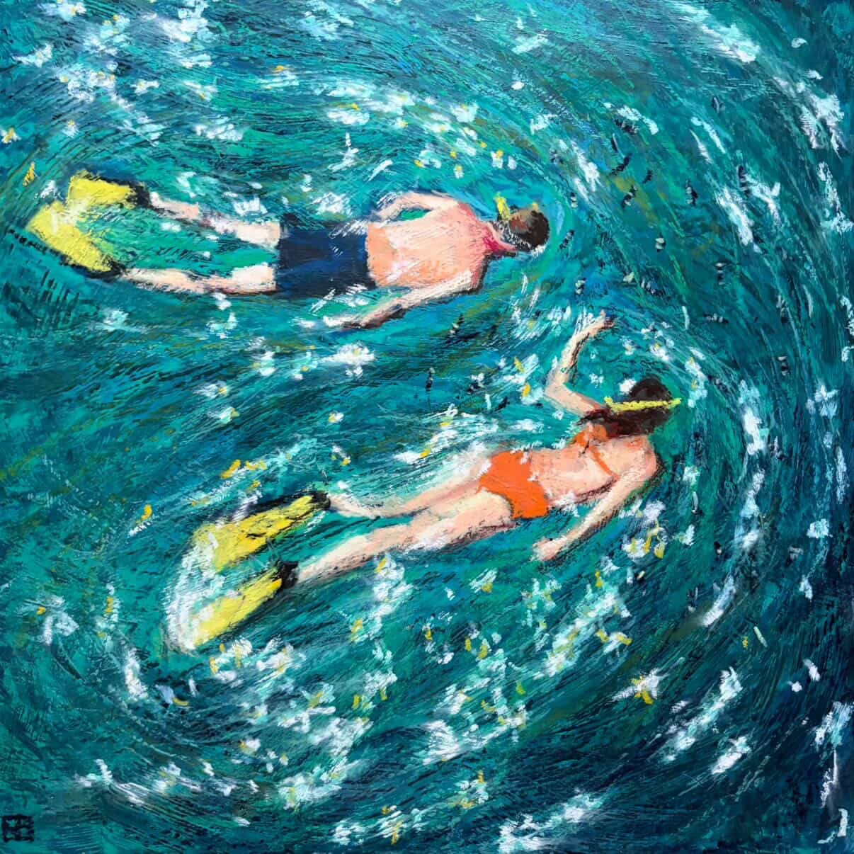 Material: oil pastel and cold wax on wood panel, with oak float frame