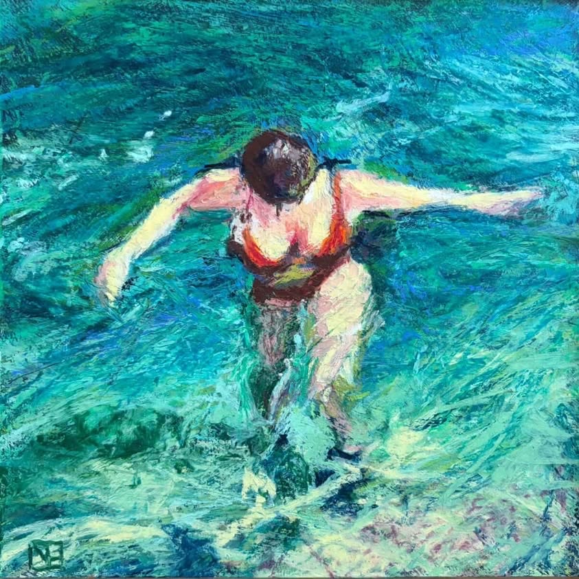 Material: oil pastel and cold wax on wood panel, with oak float frame