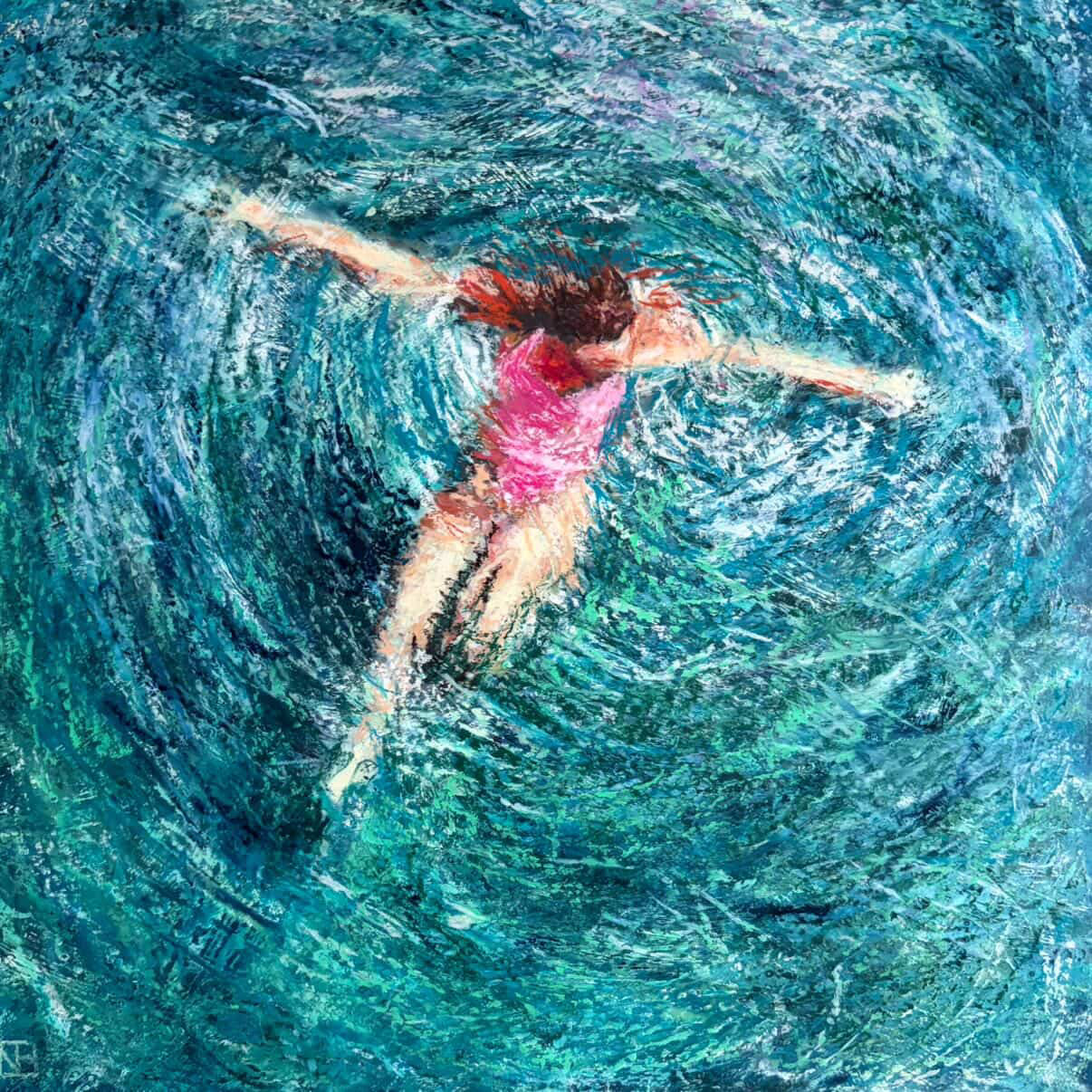 Material: oil pastel and cold wax on wood panel, with oak float frame