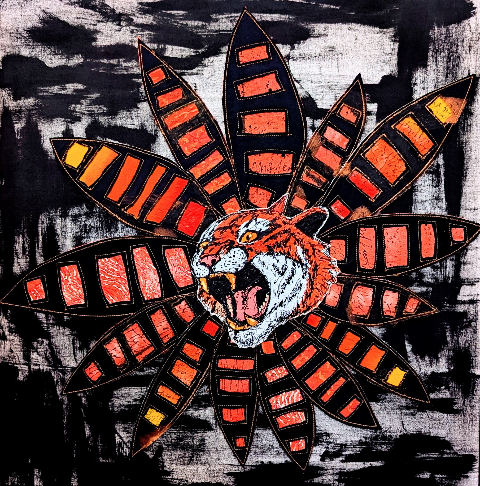 Material: Mixed media fabric assemblage on canvas